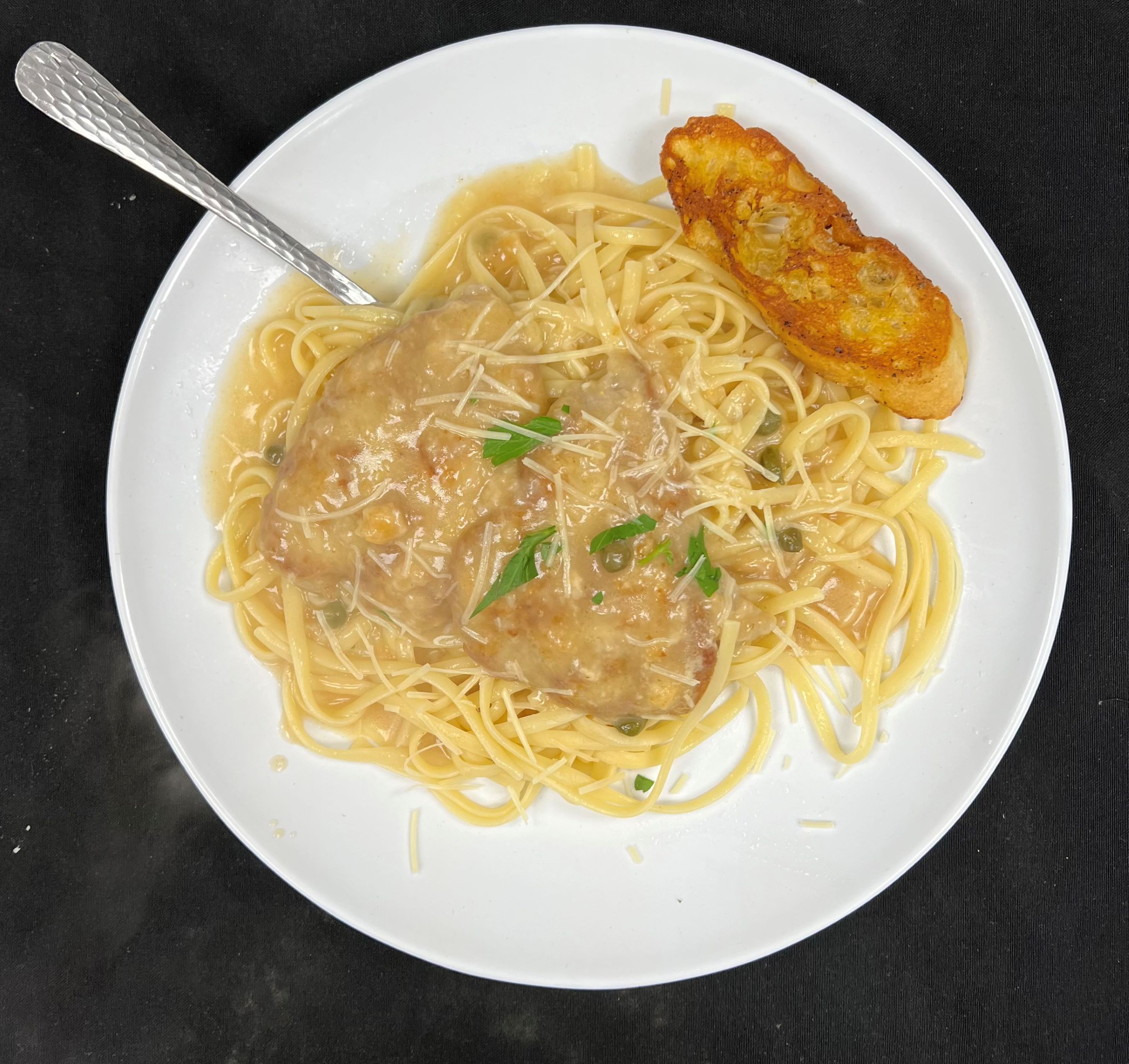 Dusted in flour and sauteed white wine, capers, served over linguine.